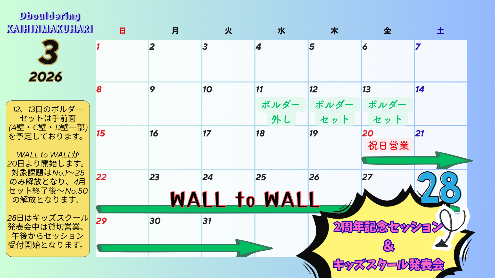3月11日(水)にA壁、C壁、D壁左側のホールド外しを行います。