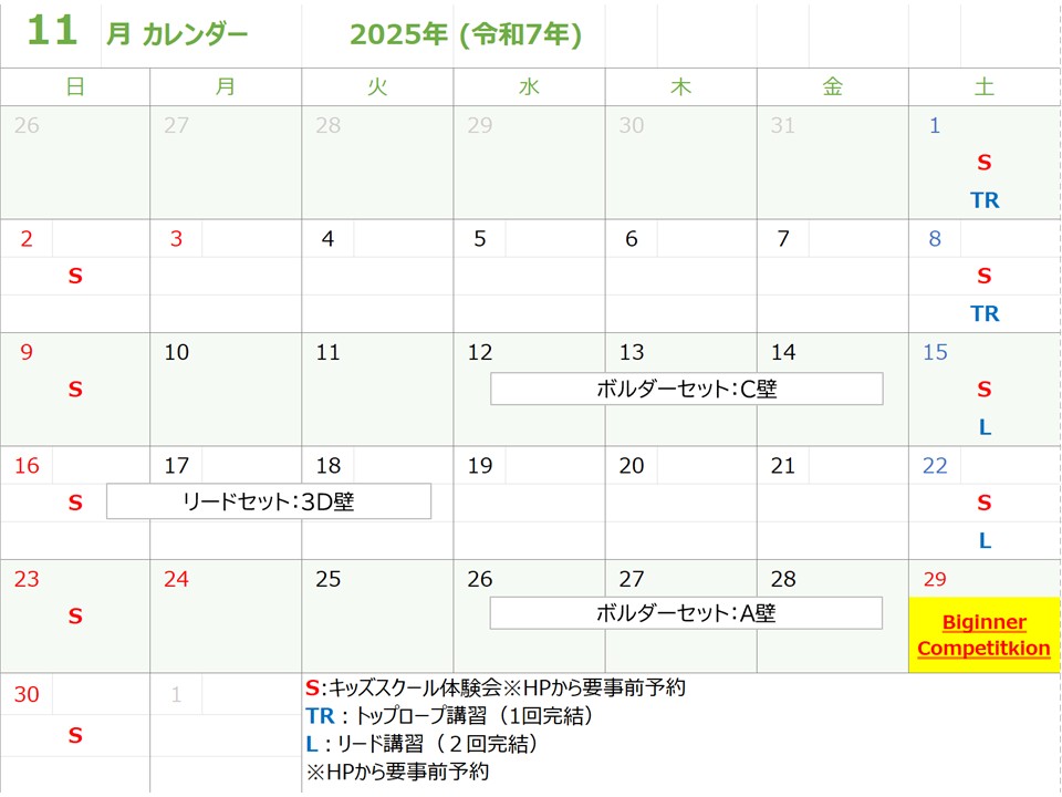 ディーボルダリングプラスリード立川店の11月スケジュールです。 キッズスクール体験会、各種講習会、ホールド替え情報を掲載していきますので 店内掲示やインスタ投稿と合わせてご確認ください。 なお各体験会・講習については当HPからの事前予約制となっていますのでお申し込みはそちらからお願いします。