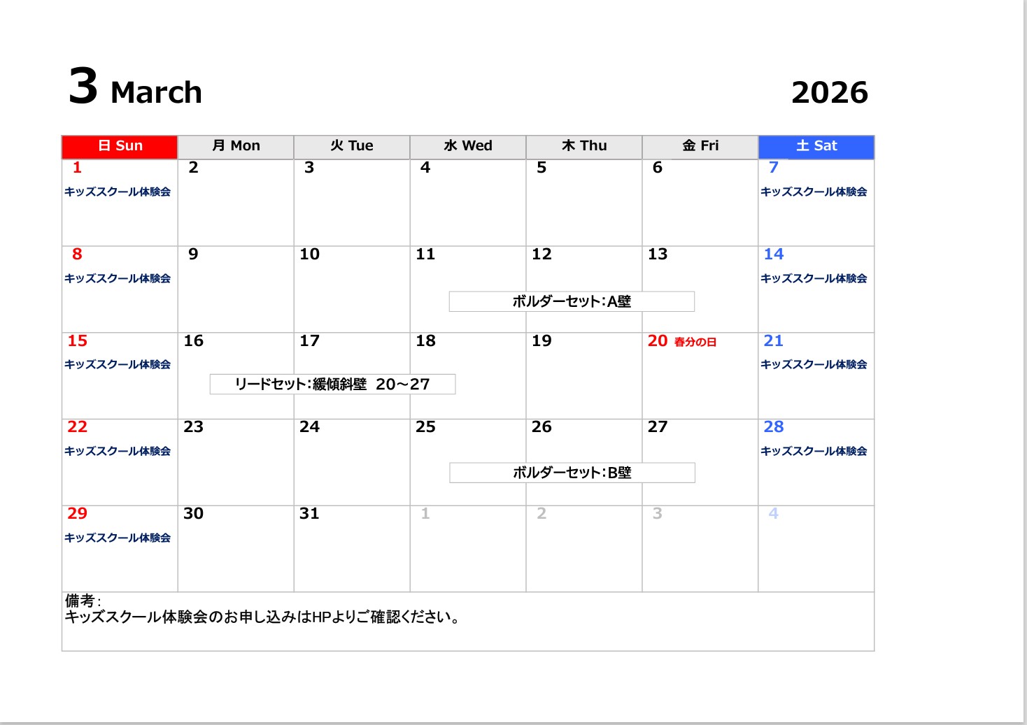 ディーボルダリングプラスリード立川店の2026年3月スケジュールです。 キッズスクール体験会、ホールド替え情報を掲載していきますので 店内掲示やインスタ投稿と合わせてご確認ください。 なお体験会については当HPからの事前予約制となっていますのでお申し込みはそちらからお願いします。