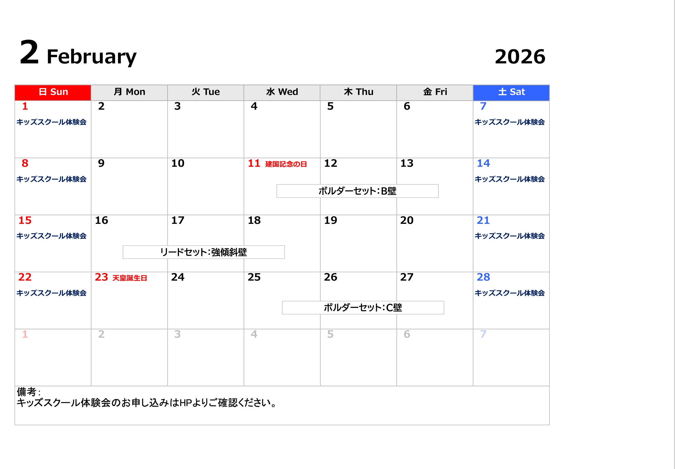 ディーボルダリングプラスリード立川店の2026年2月スケジュールです。 キッズスクール体験会、ホールド替え情報を掲載していきますので 店内掲示やインスタ投稿と合わせてご確認ください。 なお体験会については当HPからの事前予約制となっていますのでお申し込みはそちらからお願いします。