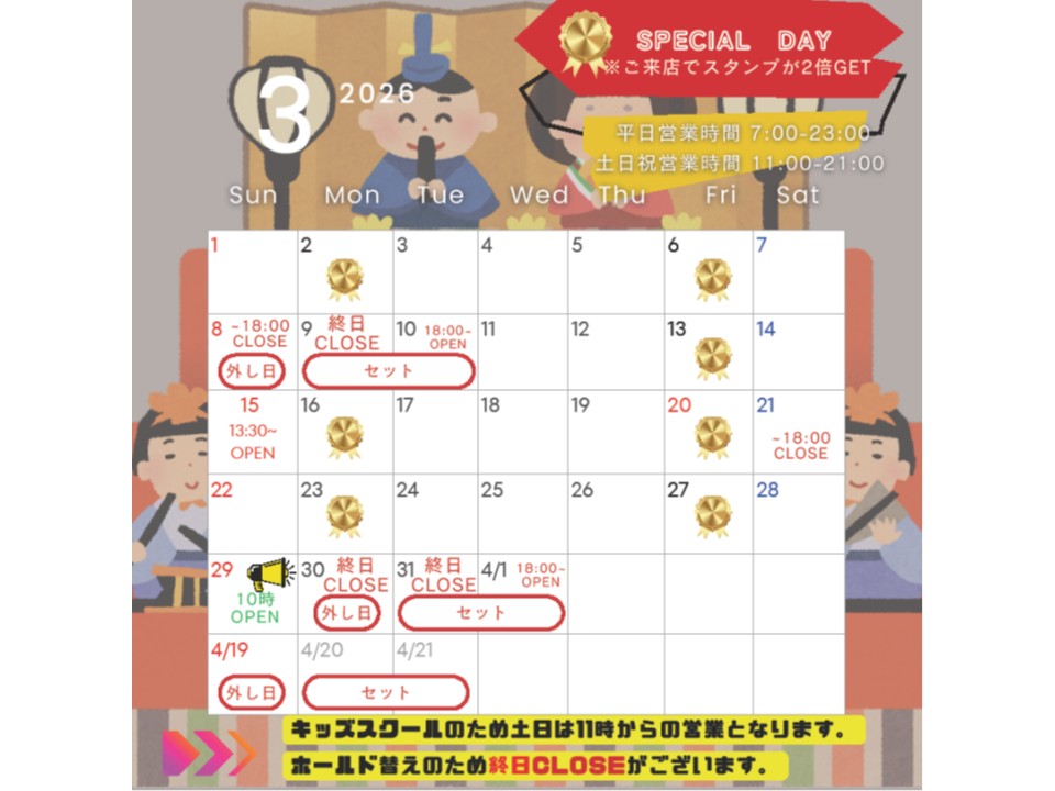 3月のカレンダーになりますのでご来店の際は忘れずチェックしてください!